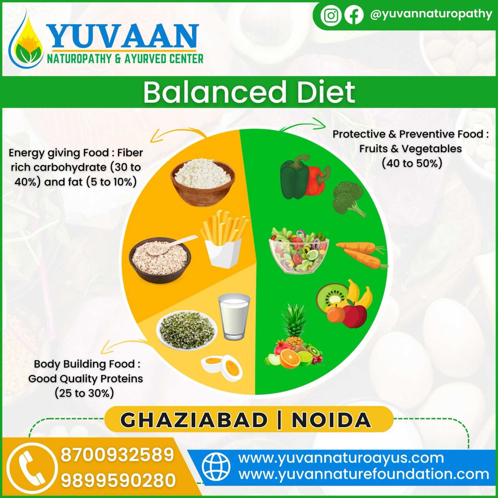 Note: Yuvaan Nature Foundation provides the knowledge about the Balance Nutrition Diet to the people so that people can take health benefits in their life. Energy giving food, body building food and Protecting & Preventing food have very important role to maintain good optimal health. Yuvaan Naturopathy & Ayurved Center is assist to people in this regard.