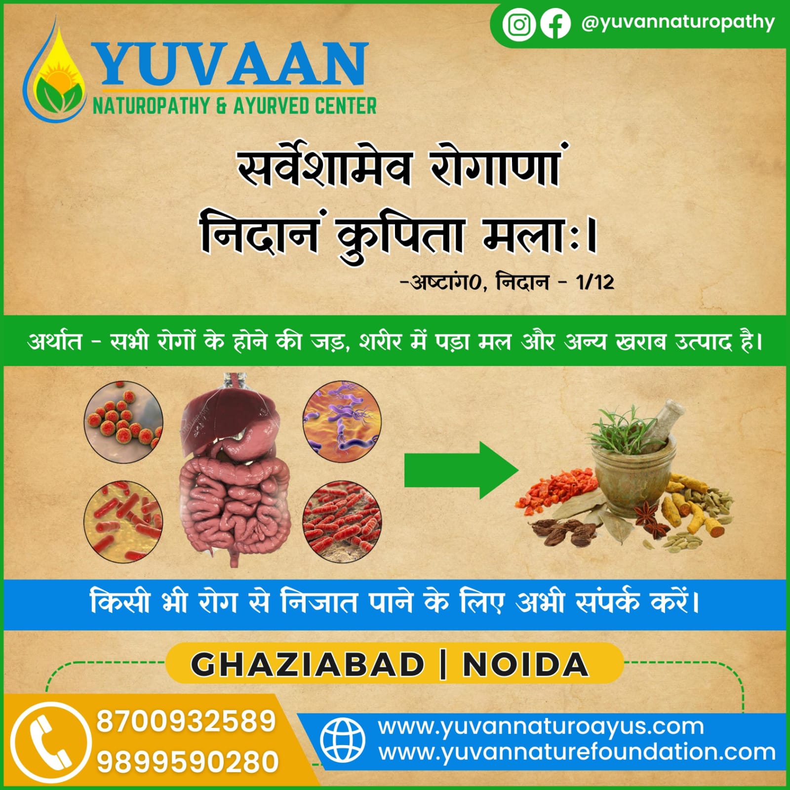Yuvaan Nature Foundation (i.e. Yuvaan Naturopathy & Ayurved Center) provides the knowledge about the natural treatment (i.e. also called nature care treatment) based upon the detoxification and nutritional diet therapy to the people so that people can take health benefits in their life by adopting the natural treatment system i.e. Naturopathy & Ayurvedic System.